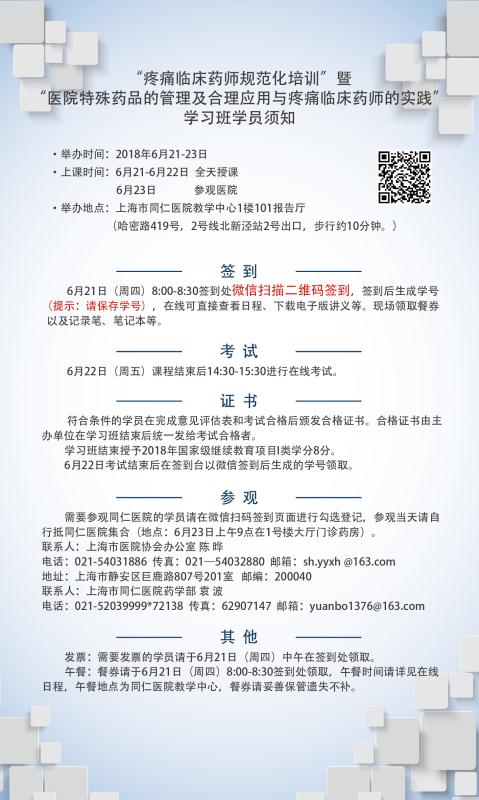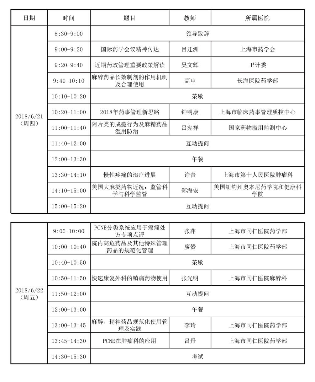 “疼痛臨床藥師規(guī)范化培訓(xùn)”暨“醫(yī)院特殊藥品管理與合理應(yīng)用”課件、學(xué)員須知及課程表