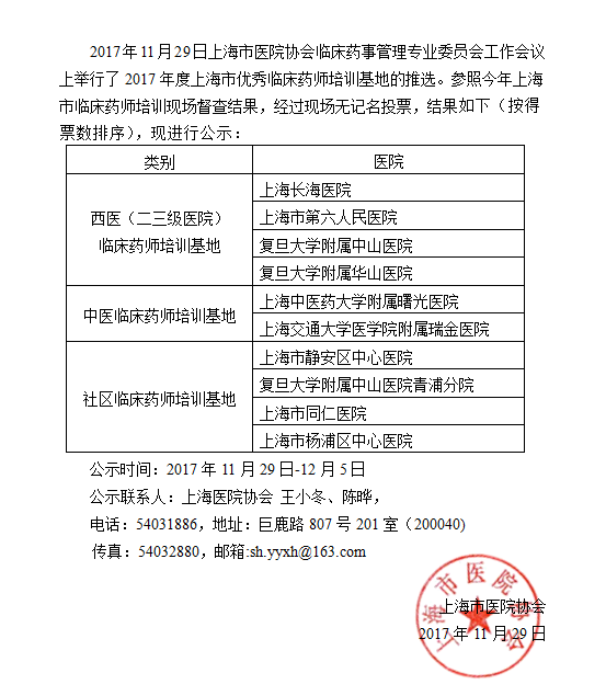 2017年度上海市優(yōu)秀臨床藥師培訓(xùn)基地公示