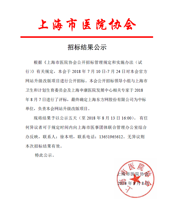 上海市醫(yī)院協(xié)會網(wǎng)站升級改版項目招標(biāo)結(jié)果公示