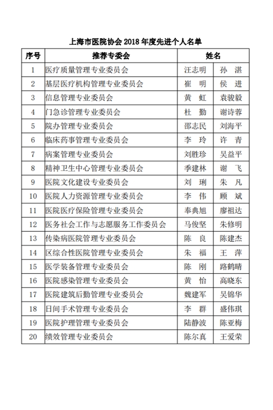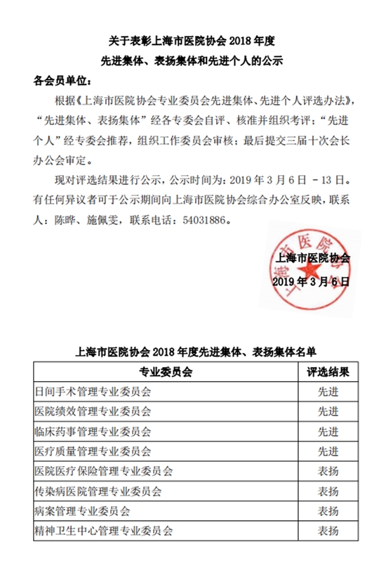 關于表彰上海市醫(yī)院協(xié)會2018年度先進集體、表揚集體和先進個人的公示